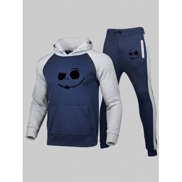 Lovely Sportswear Hooded Collar Smiley Face Print Patchwork Blue Men Two Piece Pants Set