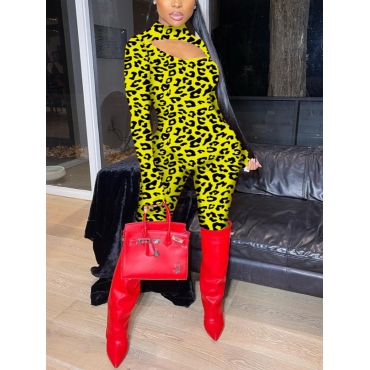 Lovely Trendy Half A Turtleneck Leopard Print Yellow Two Piece Pants Set(No-positioning Printing)