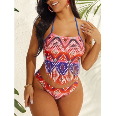 Lovely Casual Geometric Print Tassel Design Red Two-piece Swimsuit