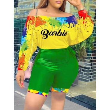 Lovely Street Off The Shoulder Letter Print Patchwork Bandage Design Green Two Piece Shorts Set