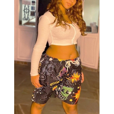 Lovely Street Graffiti Print Drawstring Black Two Piece Shorts Set