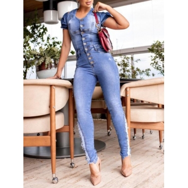 Lovely Casual V Neck Raw Edge Baby Blue One-piece Denim Jumpsuit