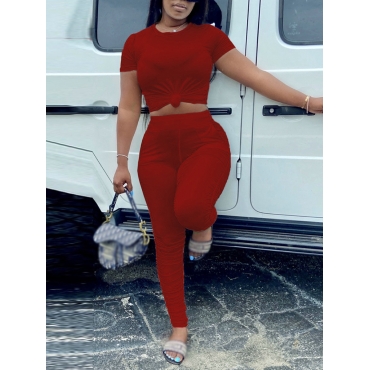 Lovely Casual O Neck Fold Design Red Two Piece Pants Set