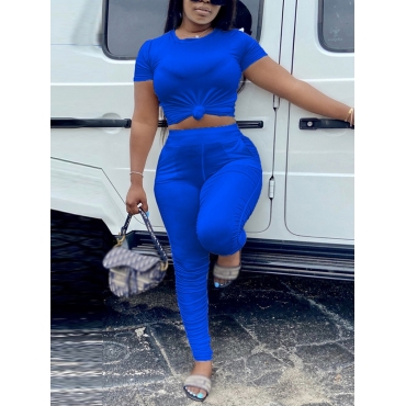 Lovely Casual O Neck Fold Design Blue Two Piece Pants Set