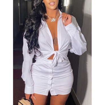 Lovely Work Turndown Collar Button Design White Two Piece Skirt Set
