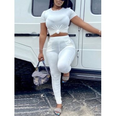 Lovely Casual O Neck Fold Design White Two Piece Pants Set