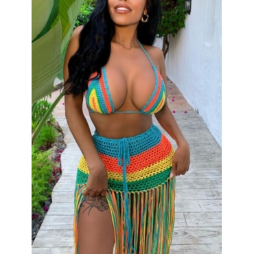 Lovely Stylish Tassel Design Color-lump Patchwork Drawstring Multicolor Cover-up