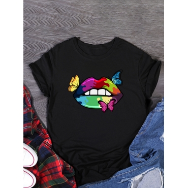 Lovely Casual Butterfly Lip Print Black Plus Size T-shirt