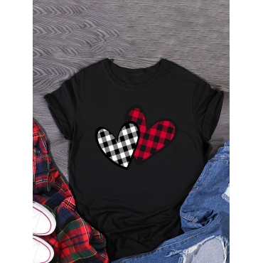 Lovely Casual O Neck Plaid Heart-shaped Print Black Plus Size T-shirt