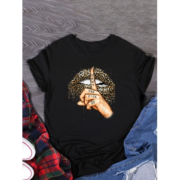 Lovely Casual Leopard Lip Print Black Plus Size T-shirt