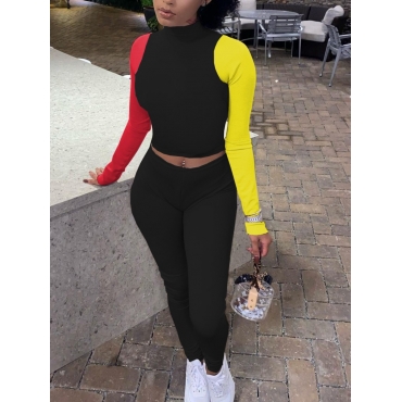 Lovely Casual Half A Turtleneck Color-lump Patchwork Black Two Piece Pants Set