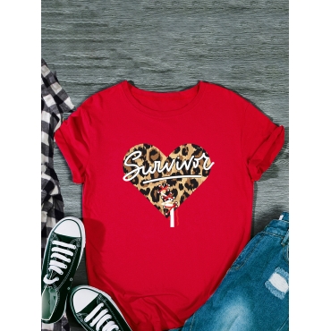 Lovely Casual O Neck Leopard Letter Print Red Plus Size T-shirt