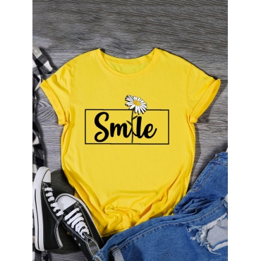 Lovely Casual O Neck Letter Floral Print Yellow Plus Size T-shirt
