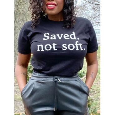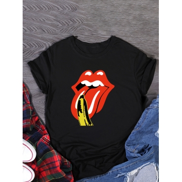 Lovely Casual O Neck Lip Print Black Plus Size T-shirt