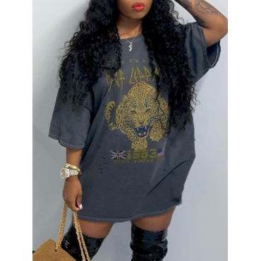 Lovely Casual Dropped Shoulder Letter Print Loose Grey Mini Dress