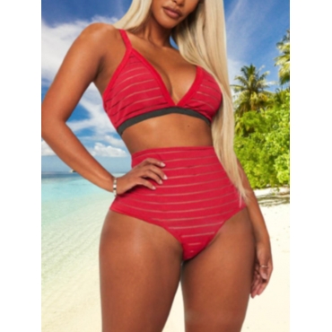 Lovely Casual V Neck Striped Red Two-piece Swimsuit