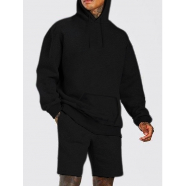 Lovely Casual Hooded Collar Drawstring Black Men Two Piece Shorts Set