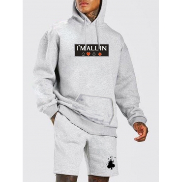 Lovely Casual Hooded Collar Letter Print Drawstring Grey Men Two Piece Shorts Set