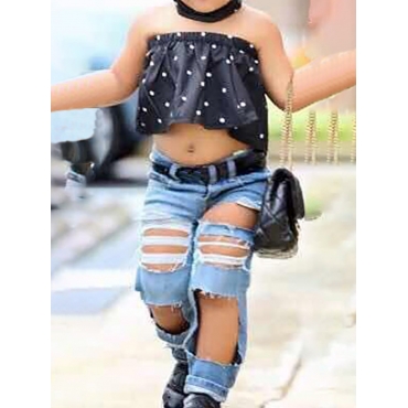 Lovely Sweet Off The Shoulder Flounce Design Ripped Black Girl Three Piece Pants Set