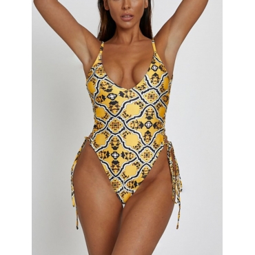 Lovely Sweet Backless Print Bandage Design Yellow One-piece Swimsuit