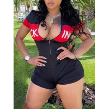 Lovely Casual Letter Print Patchwork Black One-piece Romper