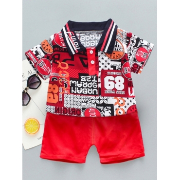 Lovely Stylish POLO Collar Letter Print Red Boy Two Piece Shorts Set