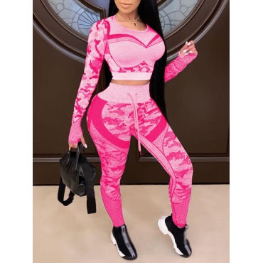 Lovely Sportswear Striped Camo Print Drawstring Rose Red Yoga Two Piece Pants Set