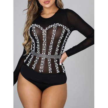 Lovely Sexy Sequined See-through Patchwork Black Bodysuit