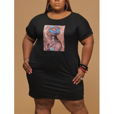 Lovely Casual O Neck Portrait Print Black Mini Plus Size Dress