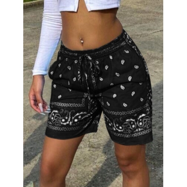Lovely Casual Mid Waist Print Drawstring Black Shorts