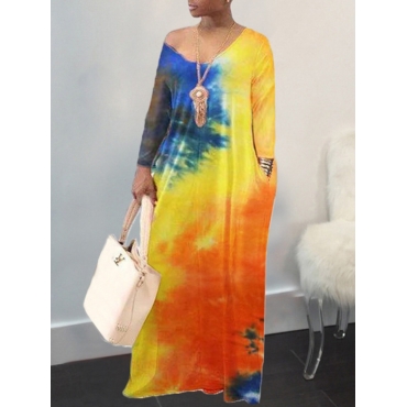 Lovely Casual V Neck Tie-dye Orange Floor Length Plus Size Dress