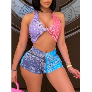 Lovely Sexy Twisted Print Patchwork Pink Two Piece Shorts Set