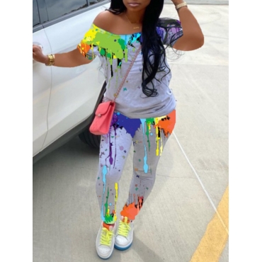 Lovely Casual O Neck Print Grey Two Piece Pants Set