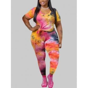 Lovely Casual O Neck Tie-dye Multicolor Plus Size Two-piece Pants Set