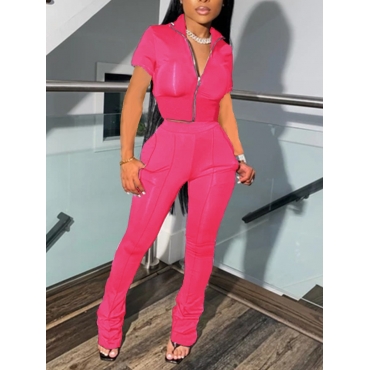 Lovely Casual Turndown Collar Zipper Design Rose Red Two Piece Pants Set