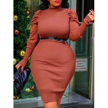 Lovely Formal Half A Turtleneck Ruffle Design Brown Knee Length Plus Size Dress(Without Belt)