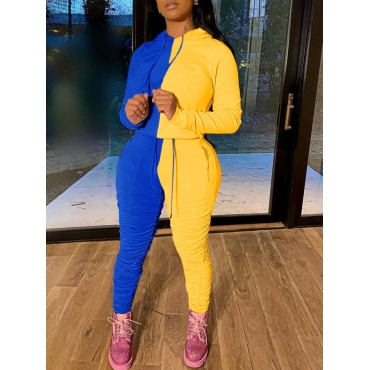 Lovely Casual Hooded Collar Patchwork Fold Design Blue Two Piece Pants Set