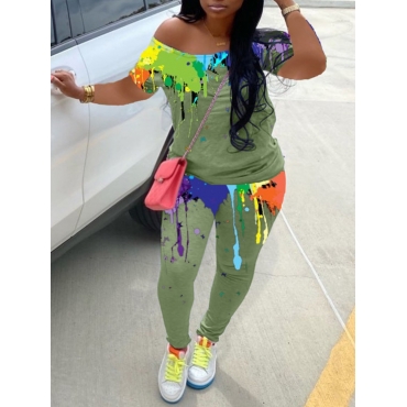 Lovely Casual O Neck Splash Ink Print Green Plus Size Two-piece Pants Set