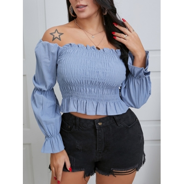 Lovely Sweet Off The Shoulder Ruched Bust Ruffle Design Blue Blouse