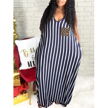Lovely Casual V Neck Striped Leopard Print Dark Blue Floor Length Plus Size Dress