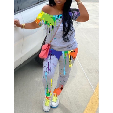 Lovely Casual O Neck Splash Ink Print Grey Plus Size Two-piece Pants Set