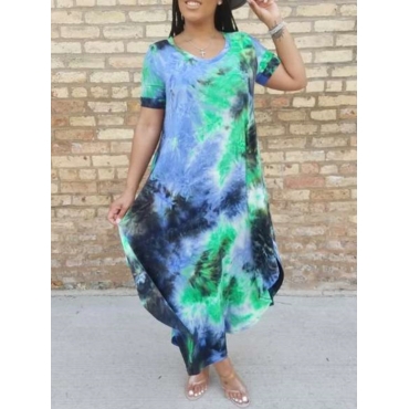 Lovely Casual U Neck Tie-dye Asymmetrical Baby Blue Ankle Length Dress