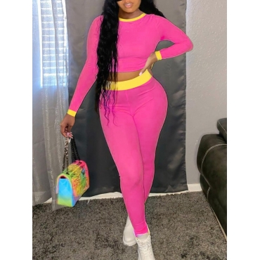 Lovely Casual O Neck Color-lump Rose Red Two Piece Pants Set