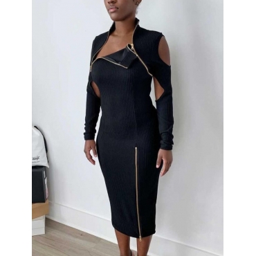 Lovely Street Hollow-out Zipper Design Black Mid Calf Dress