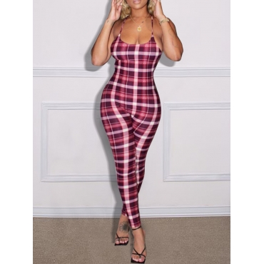 Lovely Casual Spaghetti Strap Plaid Print Pink One-piece Jumpsuit