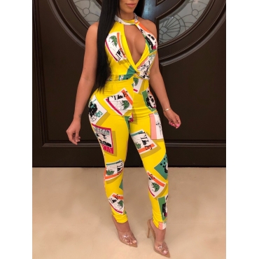 Lovely Chic Backless Letter Print Color-lump Patchwork Yellow One-piece Jumpsuit