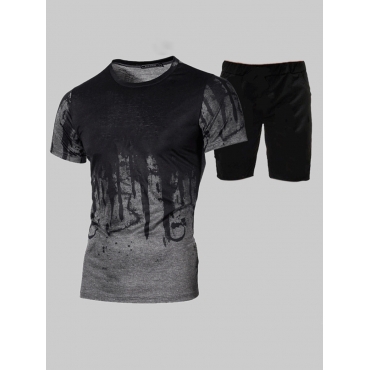 Lovely Casual O Neck Print Patchwork Dark Grey Men Two Piece Shorts Set