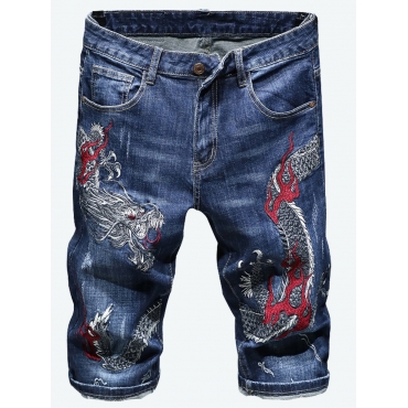 Lovely Casual Embroidered Dragon Print Blue Men Denim Shorts