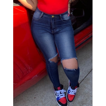 Lovely Street High-waisted Broken Holes Deep Blue Jeans