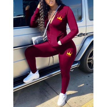 Lovely Casual Crown Print Pocket Design Wine Red Two Piece Pants Set